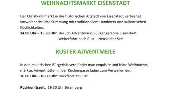 Unsere Adventfahrt geht dismal zum Weihnachtsmarkt nach Eisenstadt.Anschließend zur Ruster AdventmeileAlle Angaben im Anhang